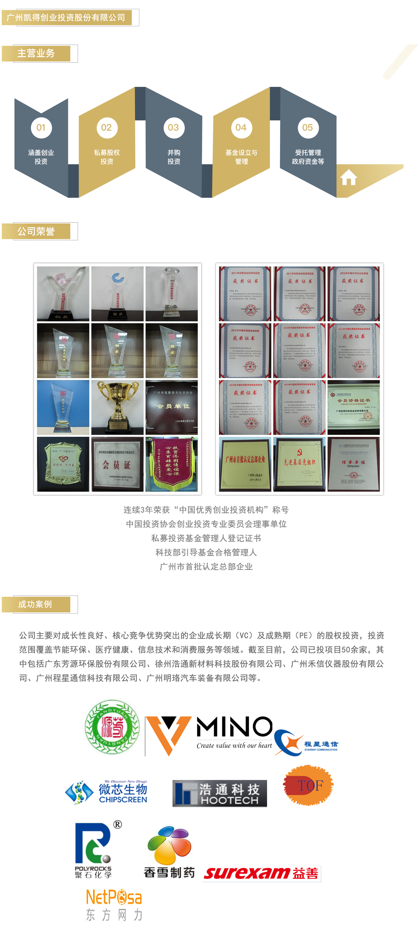广州凯得创业投资股份有限公司(简称“凯得创投”)成立于2008年,公司注册资本11.5亿元,是开发区一家国有独资专业股权投资公司,公司性质为国有股份制公司。 公司主要业务为母基金投资和股权直投两部分。涵盖创业投资、私募股权投资、并购投资、基金设立与管理以及受托管理政府资金。公司是开发区首支创业投资基金(包括引导基金、种子基金)管理人,参控股基金总规模达80多亿元。 股权投资业务:主要包括种子期项目投资、VC投资、PE投资及并购投资等。 私募股权投资基金:联合外部合作伙伴,共同设立子基金,发挥资金作用,聚焦培育优质新兴产业。 受托管理政府资金:公司负责管理广州开发区的创业投资基金(包括引导基金、种子基金)投资。